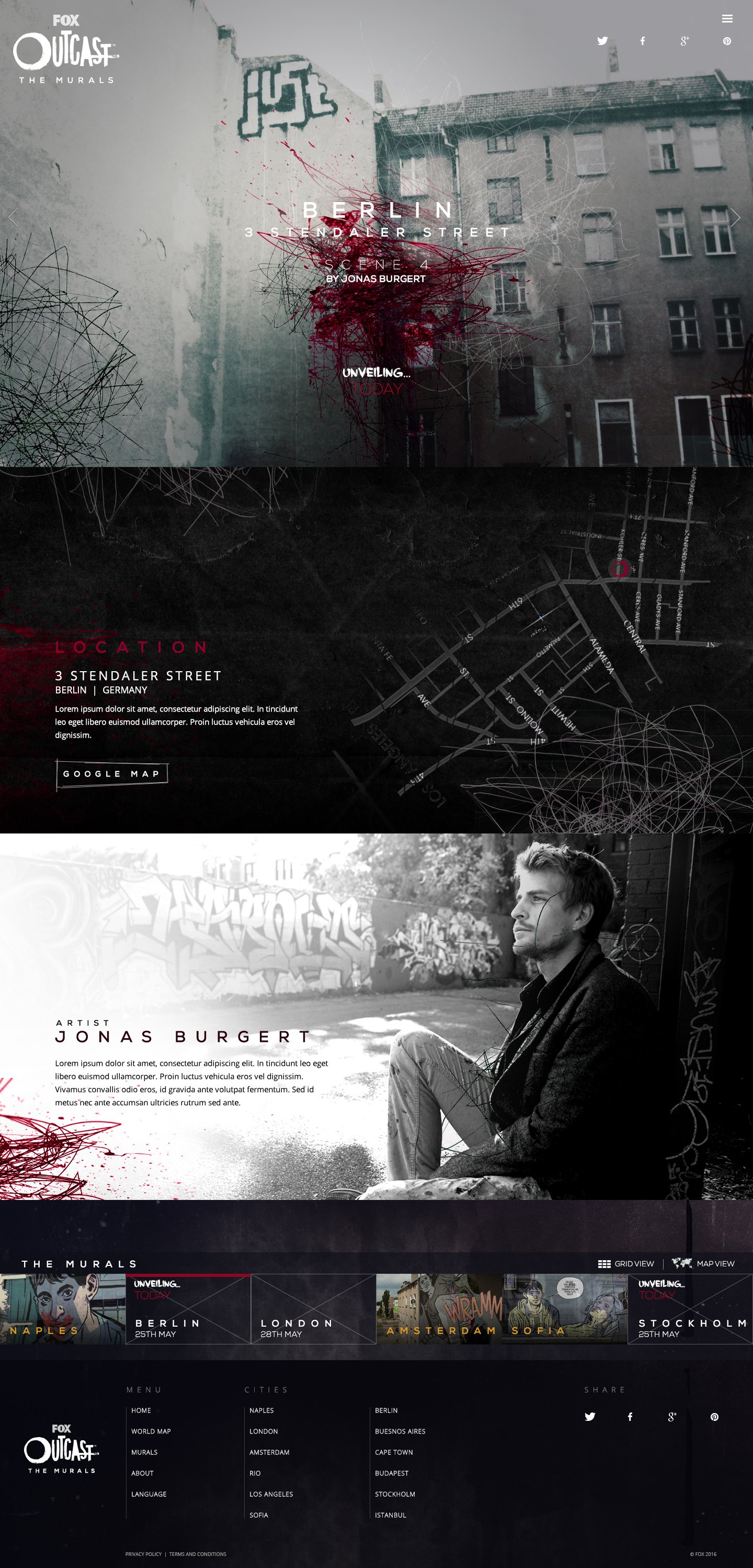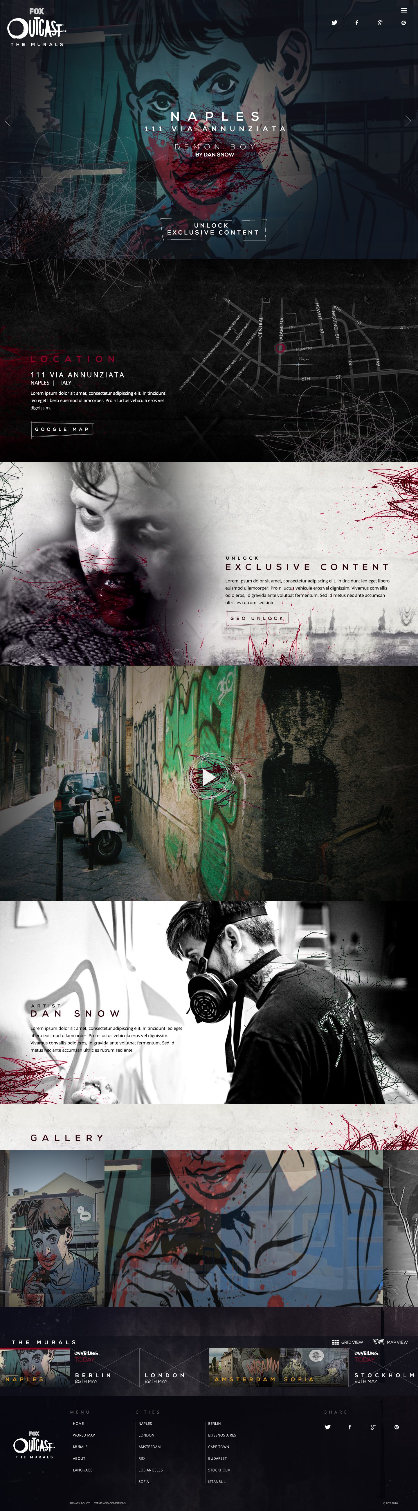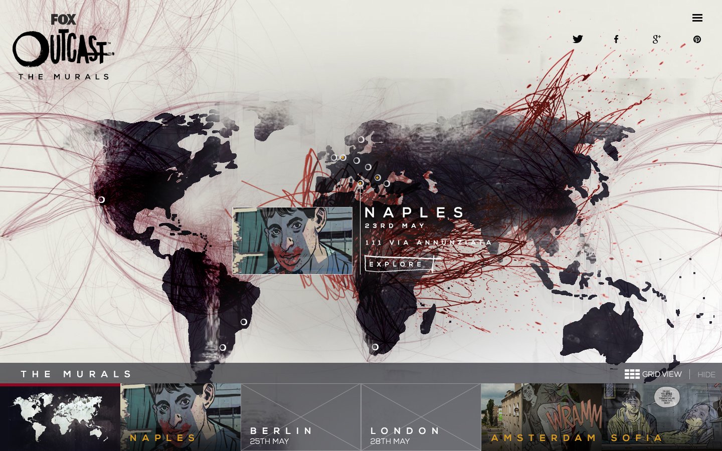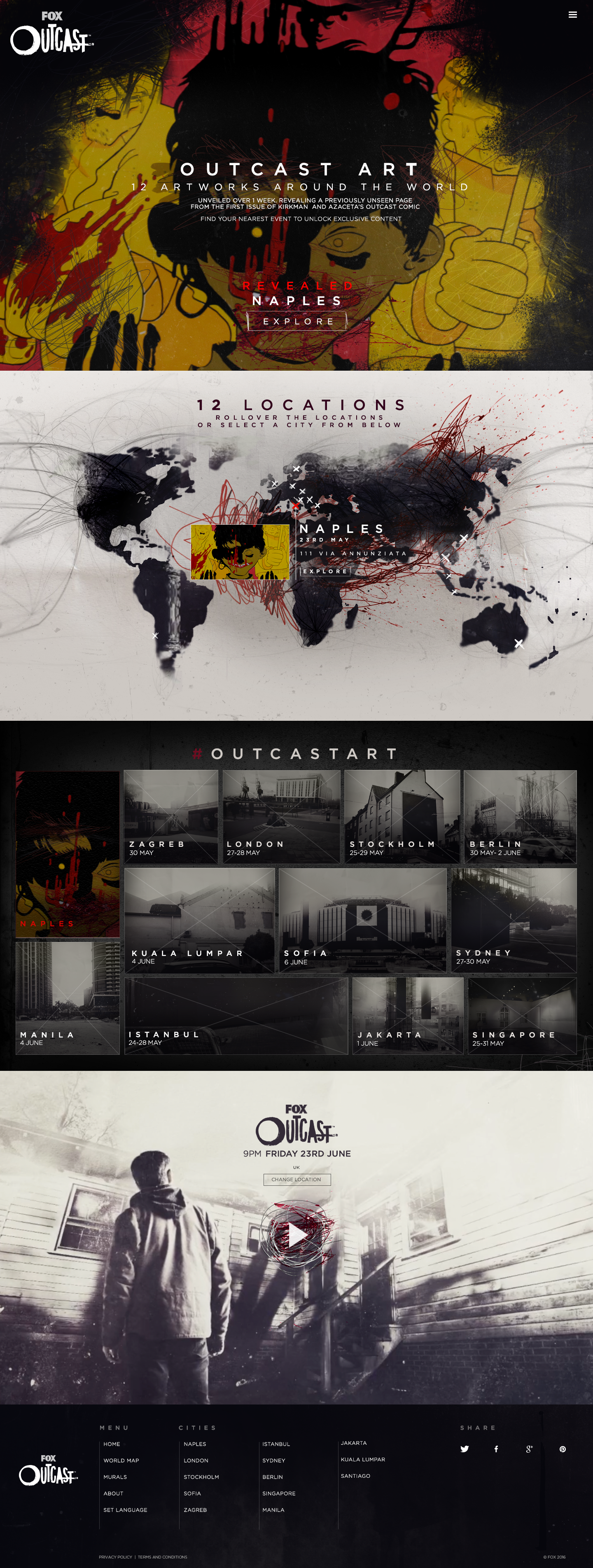 Design and creation of a worldwide, immersive stunt to promote and ignite global conversation around the launch of Outcast. The campaign gave fans a chance to see an unrevealed scene from the first issue of Outcast with 12 global renowned graffiti artists from commissioned to recreate a 12-panel comic scene into unique and individual artworks unveiled over one week.